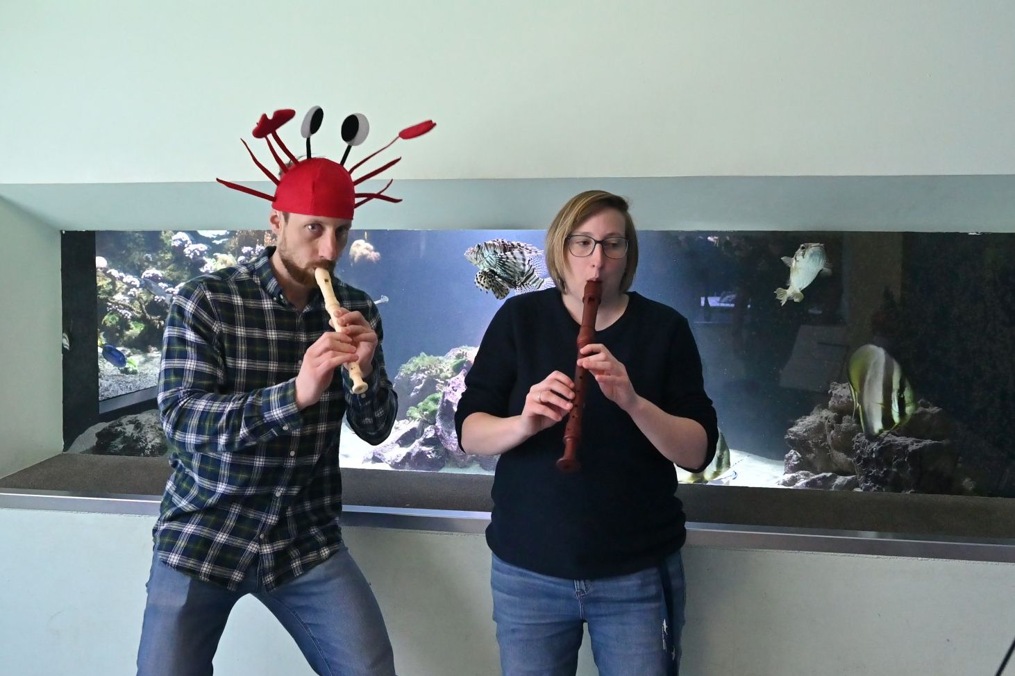 Dem Fisch kam noch eine besondere Ehre zu! Martin Moder, der selbst viele Jahre Schlagzeug in einer Band spielte, stellte seine musikalischen Fähigkeiten bei der Übergabe der Patenschaft unter Beweis: Gut behütet brachten er und Zoo-Mitarbeiterin Evelyn Deutsch, die „nebenbei“ auch noch Dirigentin & Hornistin ist, dem Trompetenfisch ein Ständchen – mit ihren Flöten! Auch ohne Trompete, die noch etwas mehr Übung gebraucht hätte, haben die beiden den Song "5 kleine Fische" auch mit den Flöten gerockt! Ein Video von der Darbietung gibt es auch: https://we.tl/t-lSwhDpm46J