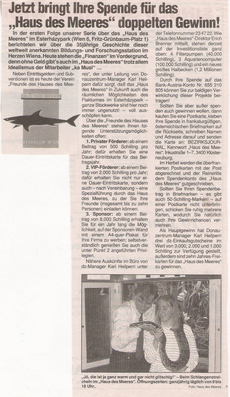 Heilpern setzte alles in Bewegung um sein erstes Ziel zu erreichen, nämlich das Startgeld von öS 10.000 zurückzuzahlen und bis Ende des Jahres 1994 die ersten öS 100.000 an unseren Verein zu überweisen. Auch das Donauzentrum beteiligte sich mit Einkaufsgutscheinen.