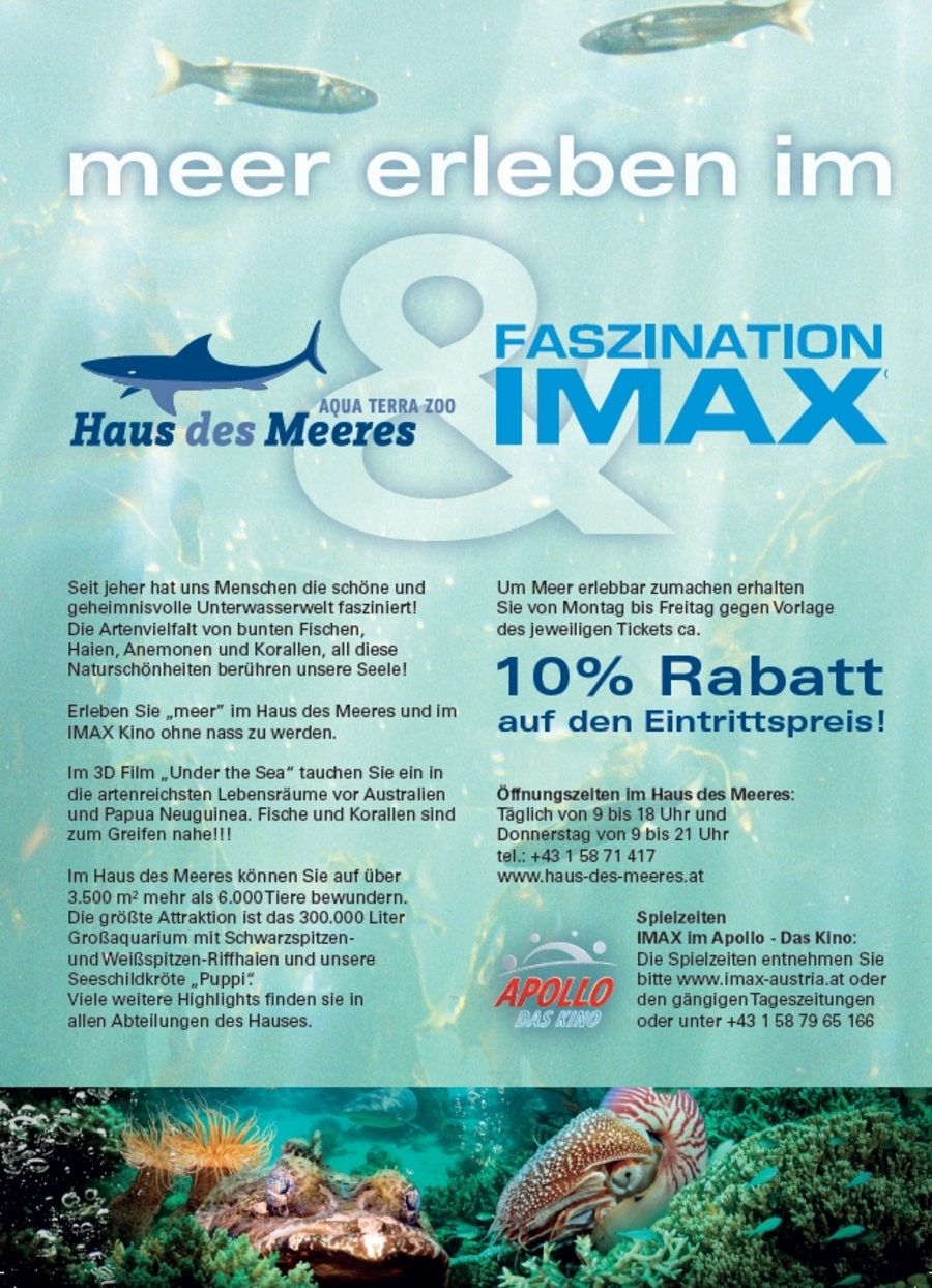 Besucher erhalten an Werktagen zehn Prozent Rabatt auf die Kinotickets bzw. die Eintrittspreise im Haus des Meeres. Dies gilt für alle, die sich in unserem Kinosaal - wo täglich zweimal der Film mit der Entstehungsgeschichte unseres Zoos gespielt wird - Lust auf "Mehr" geholt haben.