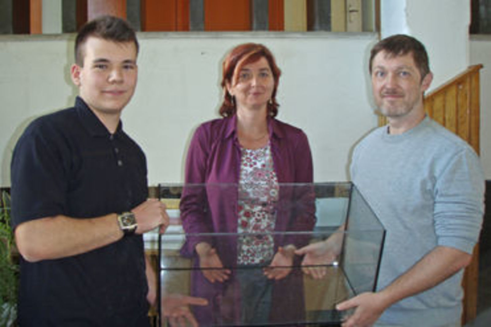 Foto groß: Kurator Mag. Michael Köck (rechts) bei der Übergabe der Sachspende des Haus des Meeres an den Initiator des Projektes, Mark Lizizcai und der Direktorin des Lajos Kossuth Gymnasiums, Frau Éva Horváth.