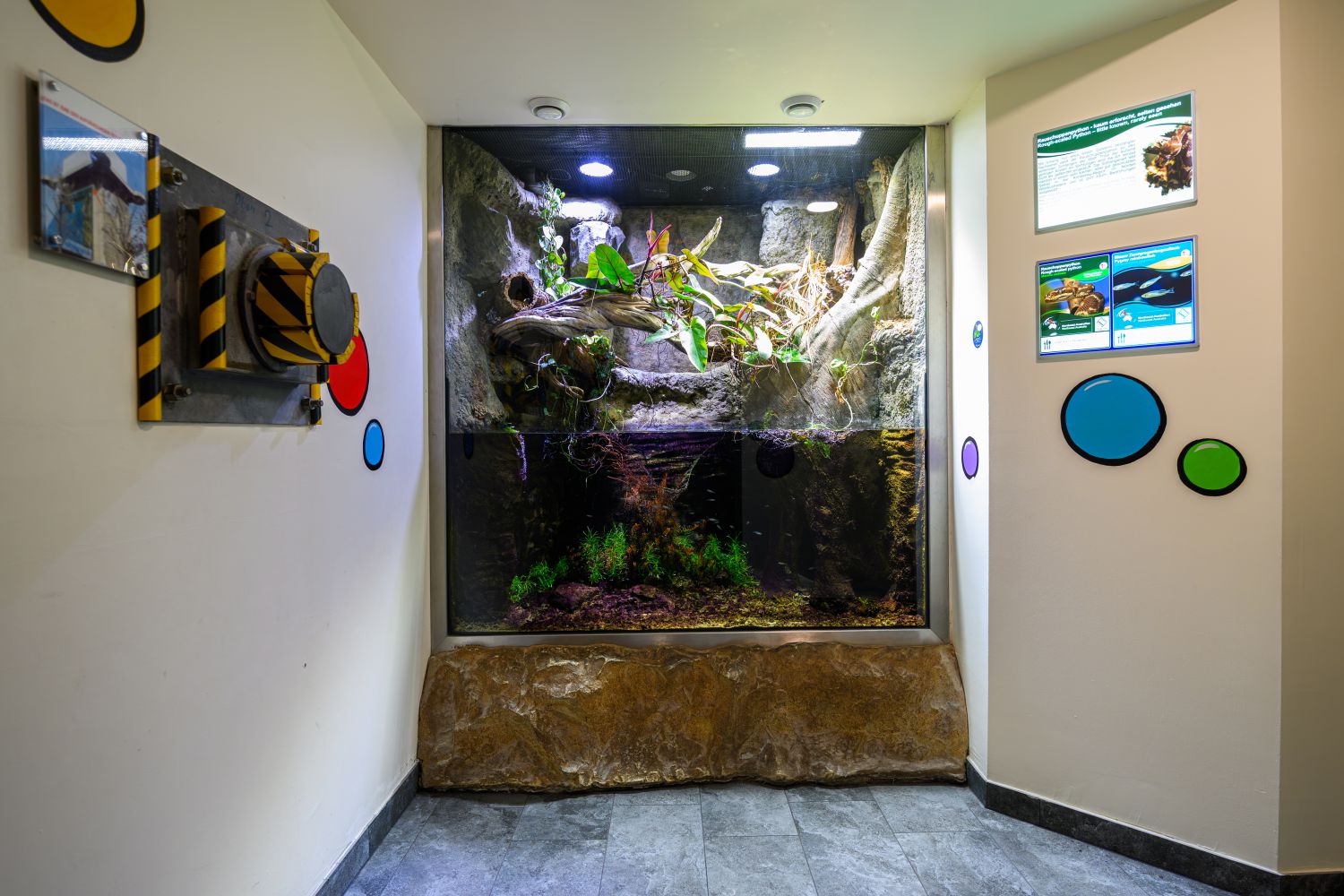 Weiter geht es zu unserem Wüsten-Terrarium: Dort leben die sogenannten Gila-Monster. Ursprünglich stammen sie aus der Sonorawüste in den USA und Mexiko, die heiße Zeit des Tages überdauern sie in selbst gegrabenen Höhlen und kommen erst in der Dämmerung an die Oberfläche, um mit Hilfe ihres hervorragenden Geruchssinnes ihre Beute aufzuspüren. Der dicke Schwanz dient ihnen dabei als Fettreserve. Die Krustenechsen stellen neben dem Komodowaran die einzigen giftigen Echsen unter den Reptilien dar. Das Gift wird in den Unterlippendrüsen produziert und gelangt über Rillen in den kräftigen Zähnen in die Wunde des Opfers. Das Gift, das so genannte Gilatoxin, ruft beim Menschen unter anderem Symptome wie starke Schmerzen, Schwellungen, Übelkeit, Herz- und Kreislaufprobleme hervor. Einer der Bestandteile des Gilatoxins wird erfolgreich zur Behandlung von Diabetes eingesetzt. Das Gila-Monster ist in seiner Heimat stark vom Aussterben bedroht. Ebenfalls im Wüsten-Terrarium zu sehen ist die Colorado-Kröte, die zur Feindabwehr ein Hautsekrekt über ihre Giftdrüsen absondert.